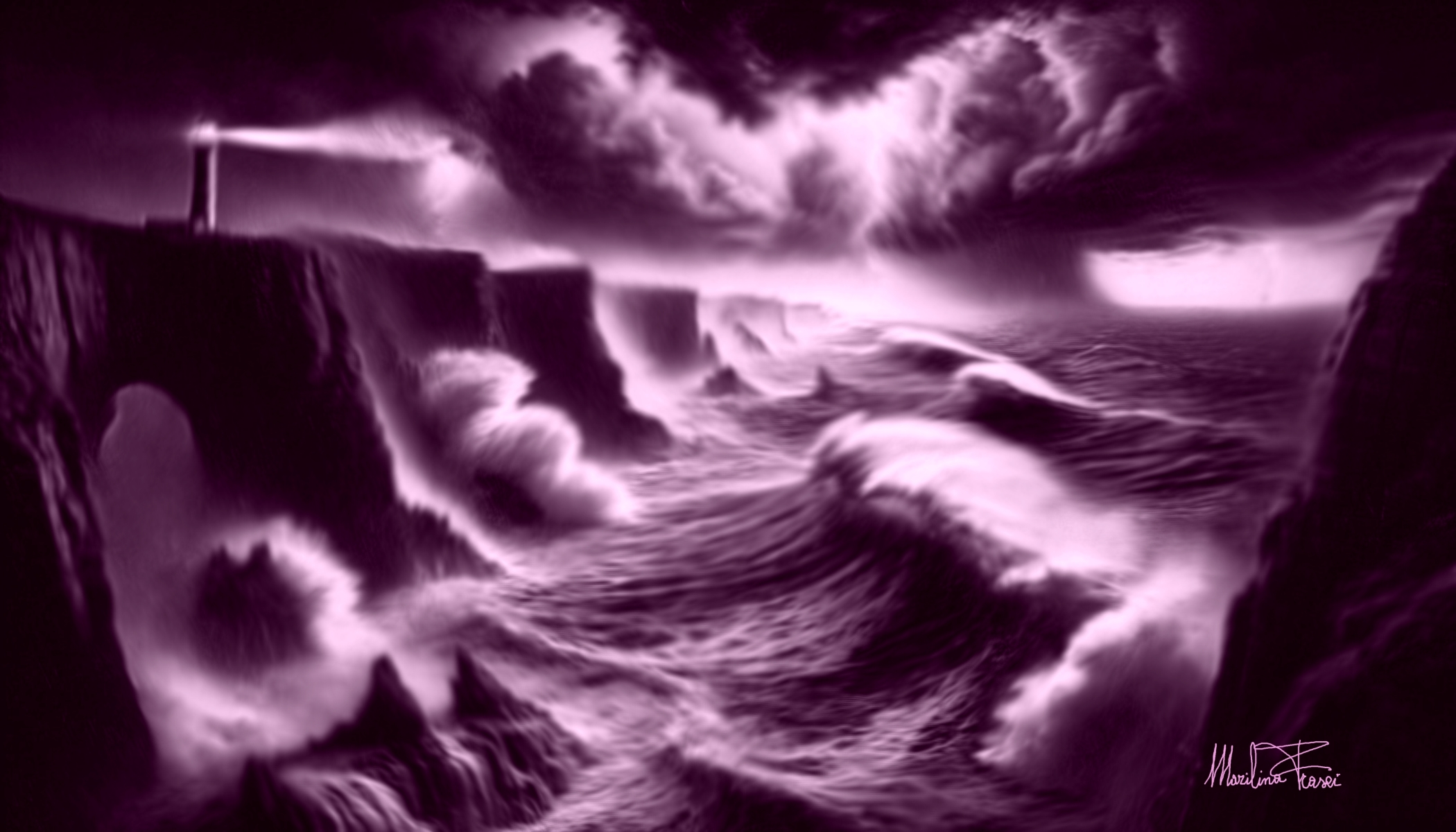 La pittura digitale "Prove d'astratto - l'arte felice – La mia tempesta" di Marilina Frasci rappresenta un drammatico e intenso omaggio all'energia della natura e alla forza interiore dell’essere umano. Con i suoi toni purpurei e sfumature surreali, l’opera evoca una scena marina turbolenta, dominata da onde imponenti che si infrangono contro scogli selvaggi. Un faro, eretto su una delle scogliere, irradia la sua luce attraverso l'oscurità, una figura di resistenza e speranza in mezzo al caos. Le nuvole che si addensano nel cielo suggeriscono la potenza implacabile della tempesta, ma anche l’equilibrio nascosto tra furia e quiete.
