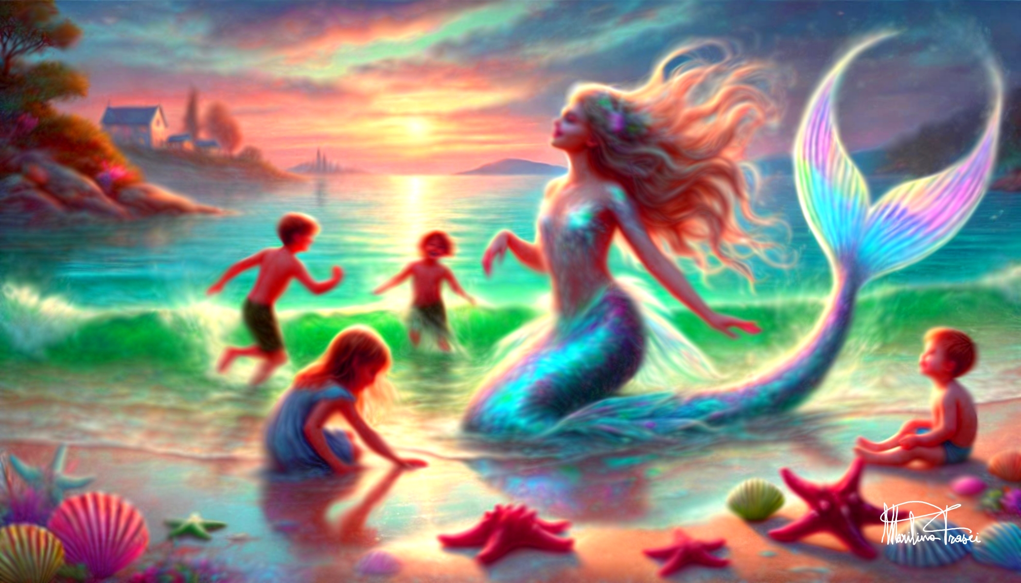 "Le stelle del mare" non è solo un paesaggio, ma una celebrazione della connessione tra uomo e natura, tra realtà e immaginazione. La presenza dei bambini invita a riflettere sul valore della meraviglia infantile, mentre la sirena, con la sua grazia e il suo mistero, aggiunge un elemento di magia che ci ricorda quanto sia importante conservare la capacità di sognare.