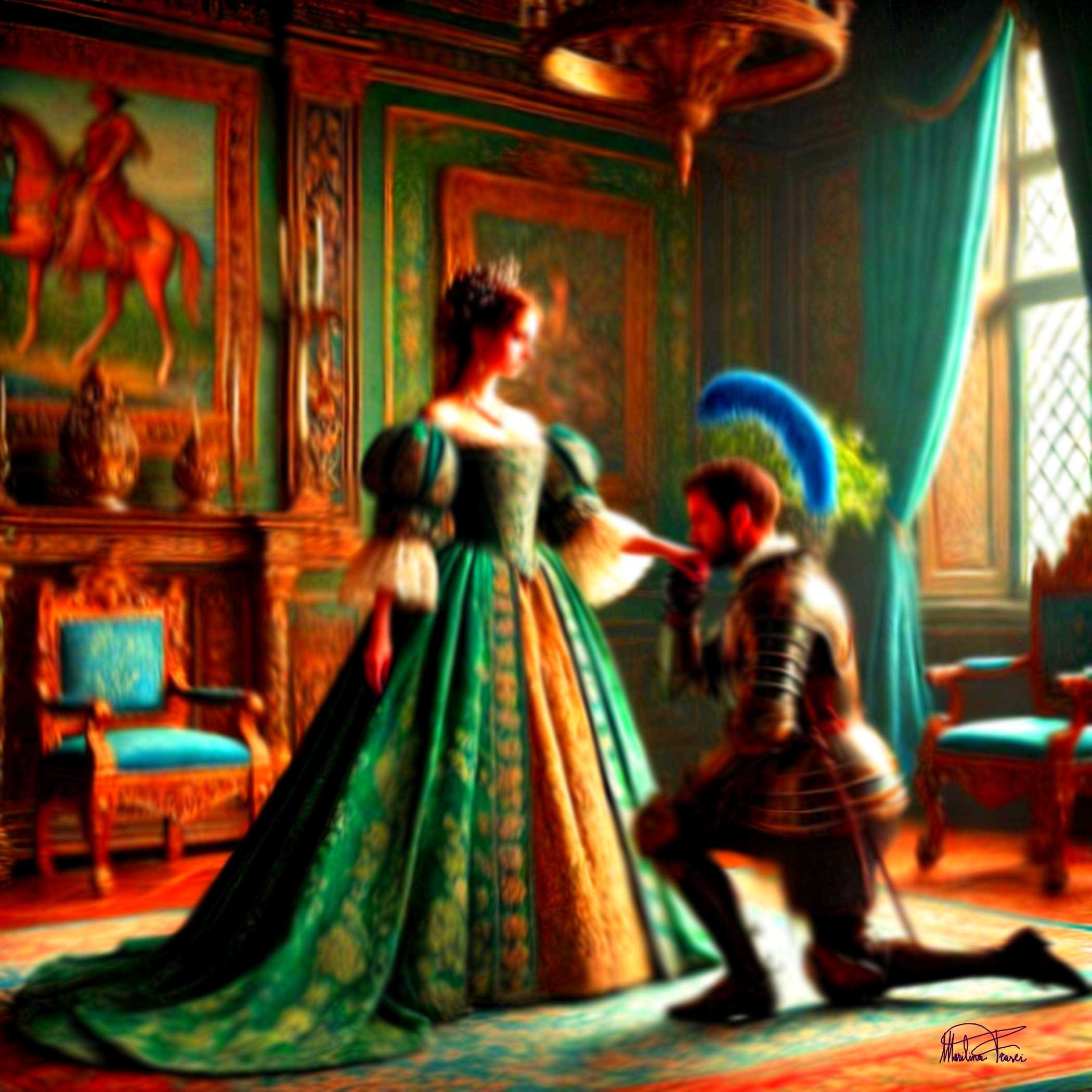La pittura digitale "Prove d'astratto - l'arte felice – Il baciamano" di Marilina Frasci incarna un momento di straordinaria eleganza e romanticismo. L'immagine, permeata da una ricca atmosfera decorativa, rappresenta il gesto gentile e simbolico di un uomo inginocchiato che bacia la mano di una donna splendidamente abbigliata. Quest’opera trasmette una raffinatezza che affonda le radici nella tradizione della ritrattistica e della rappresentazione sociale storica, ma riesce a esprimere una freschezza che è propria dell'arte digitale.
