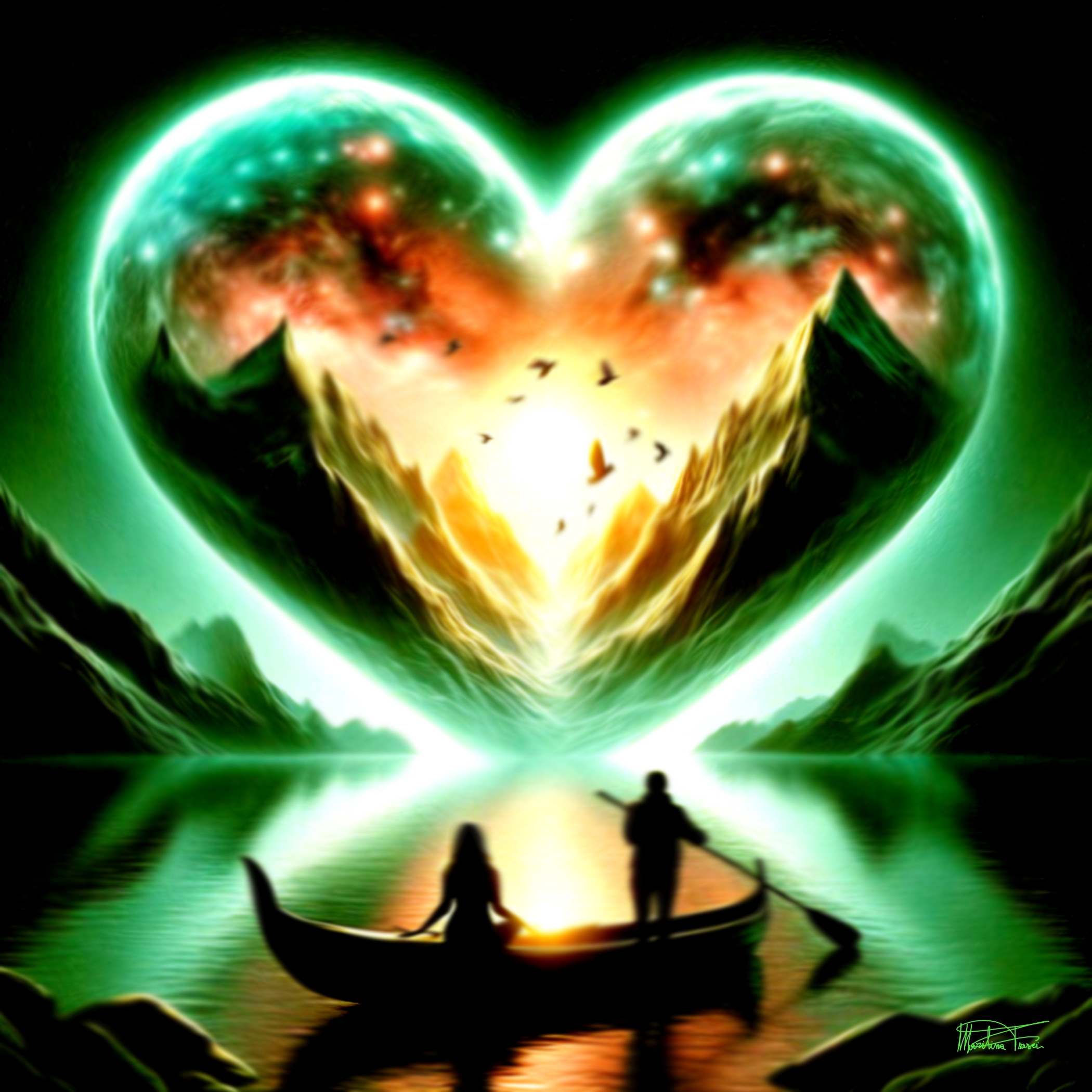 La pittura digitale "Prove d'astratto - l'arte felice – I silenzi del cuore" di Marilina Frasci emerge come un canto visivo che mescola natura e fantasia in un abbraccio carico di emozioni. Il centro dell’opera, dominato dalla formazione di montagne e cielo a forma di cuore, costituisce un simbolo universale di amore e introspezione. I colori vibranti che illuminano il cuore—tonalità di verdi, arancioni e rossi—creano un effetto surreale e quasi trascendente, evocando sentimenti di speranza e serenità.