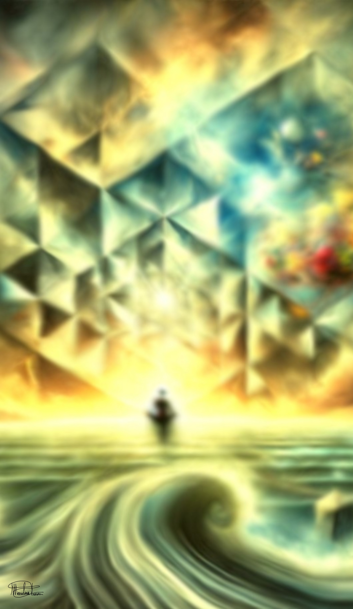 L'opera digitale di Marilina Frasci, intitolata “Prove d'astratto - l'arte felice – L’immaginazione 5”, si presenta come un inno alla creatività e alla fantasia, fondendo il dinamismo della forma astratta con la poesia della geometria. In questo lavoro, una nave sospinta da onde quasi palpabili si staglia su uno sfondo che sembra sognare, composto da un mosaico di sfumature piramidali. L'effetto è magico: un dialogo tra luce, movimento e quiete.