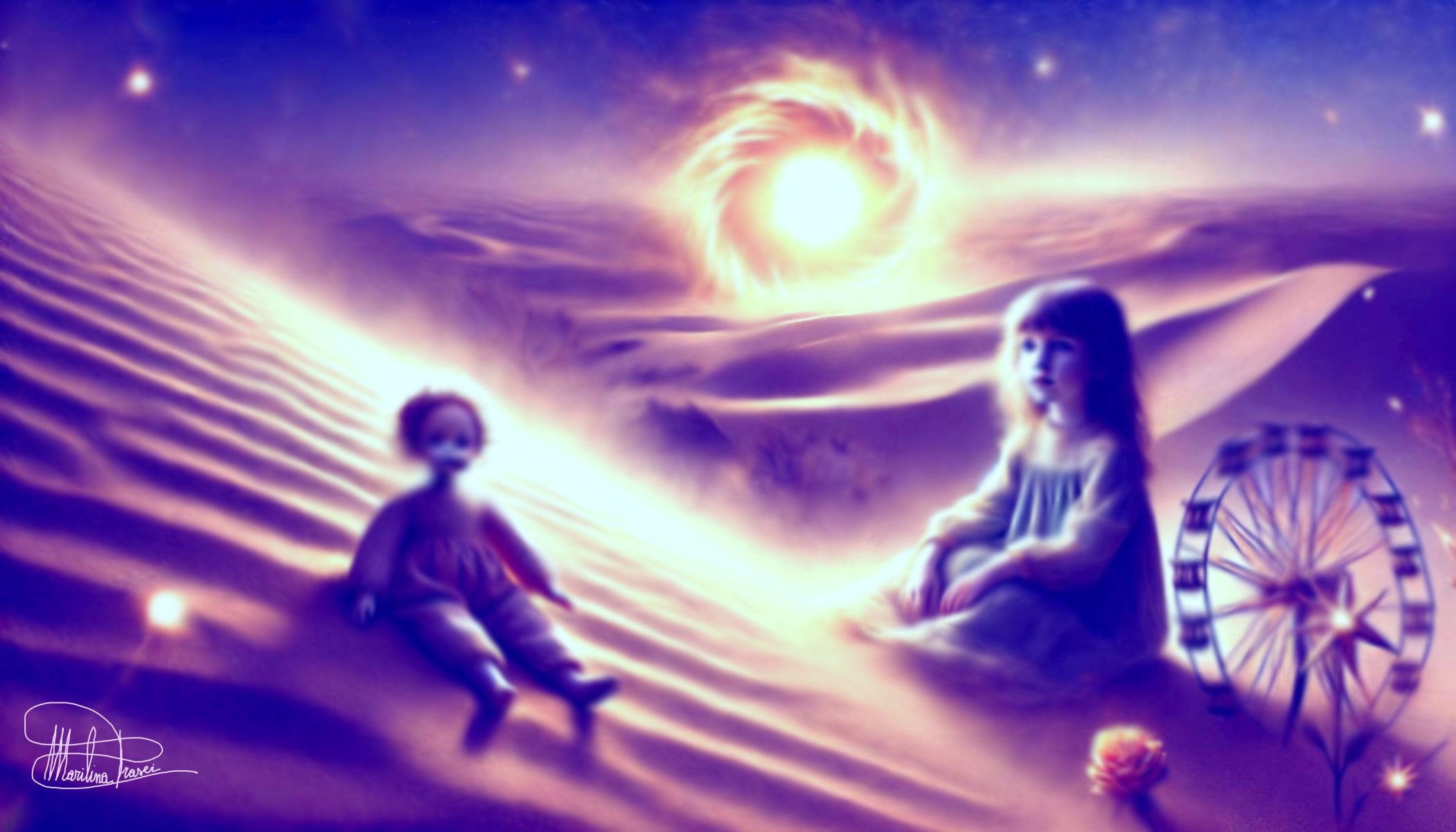 La composizione è dominata da un paesaggio desertico dai toni soffusi, dove le dune sembrano onde di un mare immobile. Una bambina e una bambola condividono questo spazio rarefatto, mentre un orologio deformato si staglia sulla destra, alludendo al concetto di tempo instabile, che richiama inevitabilmente le "persistenze della memoria" di Salvador Dalí. Eppure, a differenza del Surrealismo daliniano, qui il tempo non si liquefa per evocare un’angoscia esistenziale, bensì si dissolve in un'atmosfera eterea, quasi rassicurante.