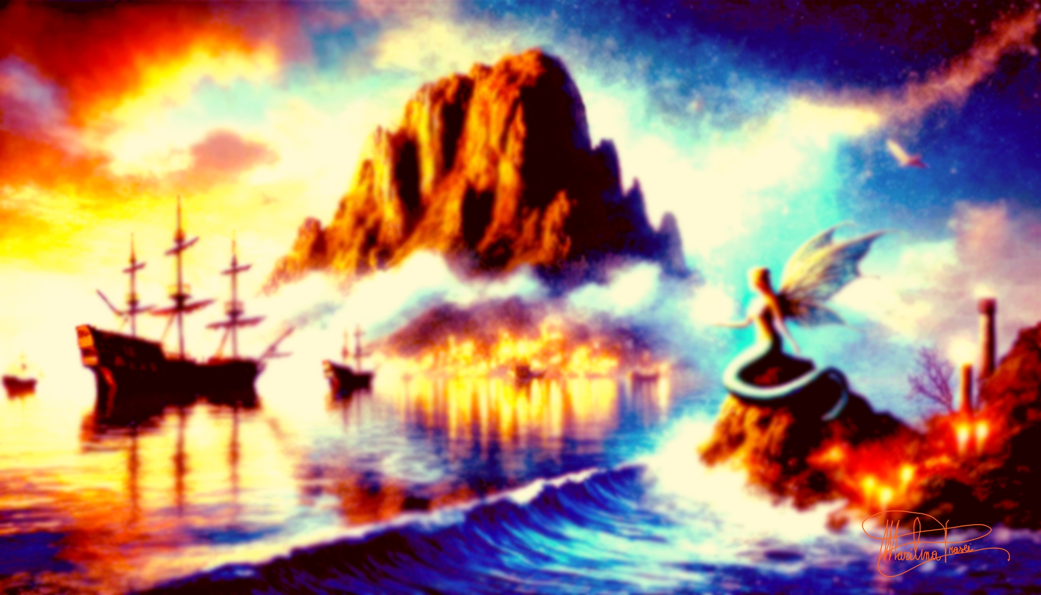 La figura della sirena alata, elemento di ibridazione tra il regno marino e quello celeste, richiama il dualismo tra desiderio e paura, tra attrazione e pericolo, tema caro sia all’iconografia classica che al Simbolismo fin de siècle. Gli occhi dello spettatore sono attratti dal bagliore dell’isola in fiamme, che potrebbe evocare la caduta di Atlantide, la rovina di un’epoca dorata o il fuoco della passione che divampa prima di estinguersi.