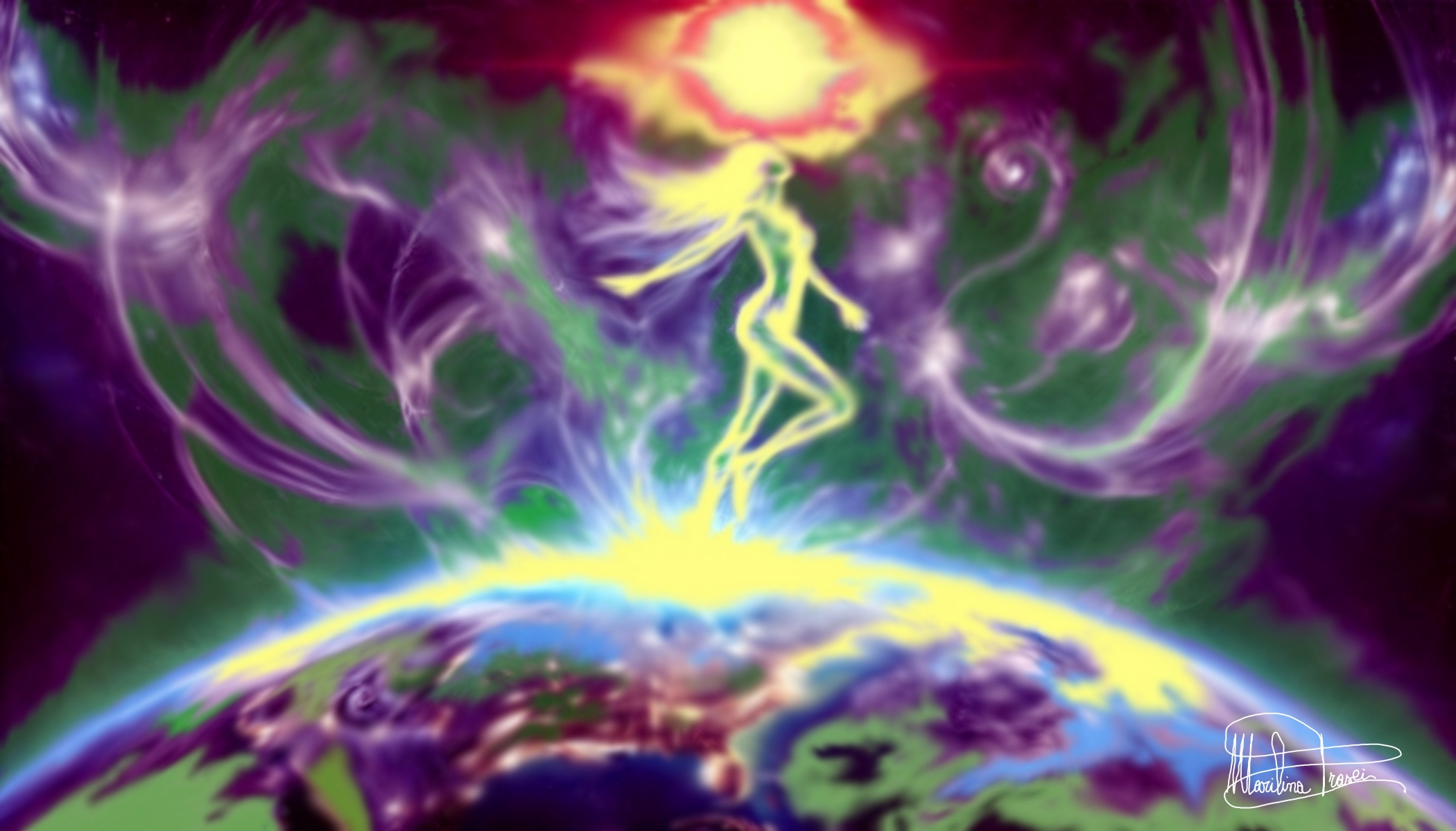 L’immagine mostra una figura femminile eterea, costituita da pura energia luminosa, che si libra al di sopra della Terra irradiando luce e vibrazione cosmica. La testa della figura è congiunta a una fonte solare, che sembra infonderle potenza e consapevolezza universale. Lo sfondo, avvolto in movimenti energetici e cosmici, ricorda i vortici galattici di Van Gogh ne La notte stellata, ma qui il dinamismo si manifesta con un linguaggio completamente digitale, evocando le più moderne rappresentazioni della fisica quantistica e dell’energia astrale.