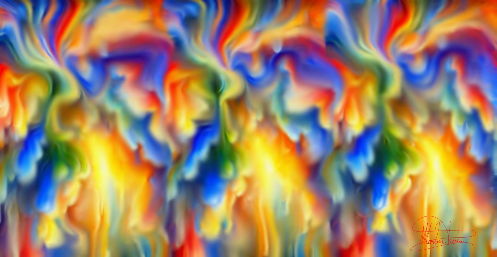 La pittura digitale, qui magistralmente rielaborata dall’artista, non è solo un mezzo tecnico, ma un’estensione del sentire umano: le sfumature calde e fredde dialogano tra loro, suggerendo la coesistenza degli opposti – il reale e l’onirico, il caos e l’ordine, la gioia e la malinconia. C'è una danza luminosa tra le forme morbide e i contrasti cromatici, che non si oppongono, ma si abbracciano in un fluire continuo.