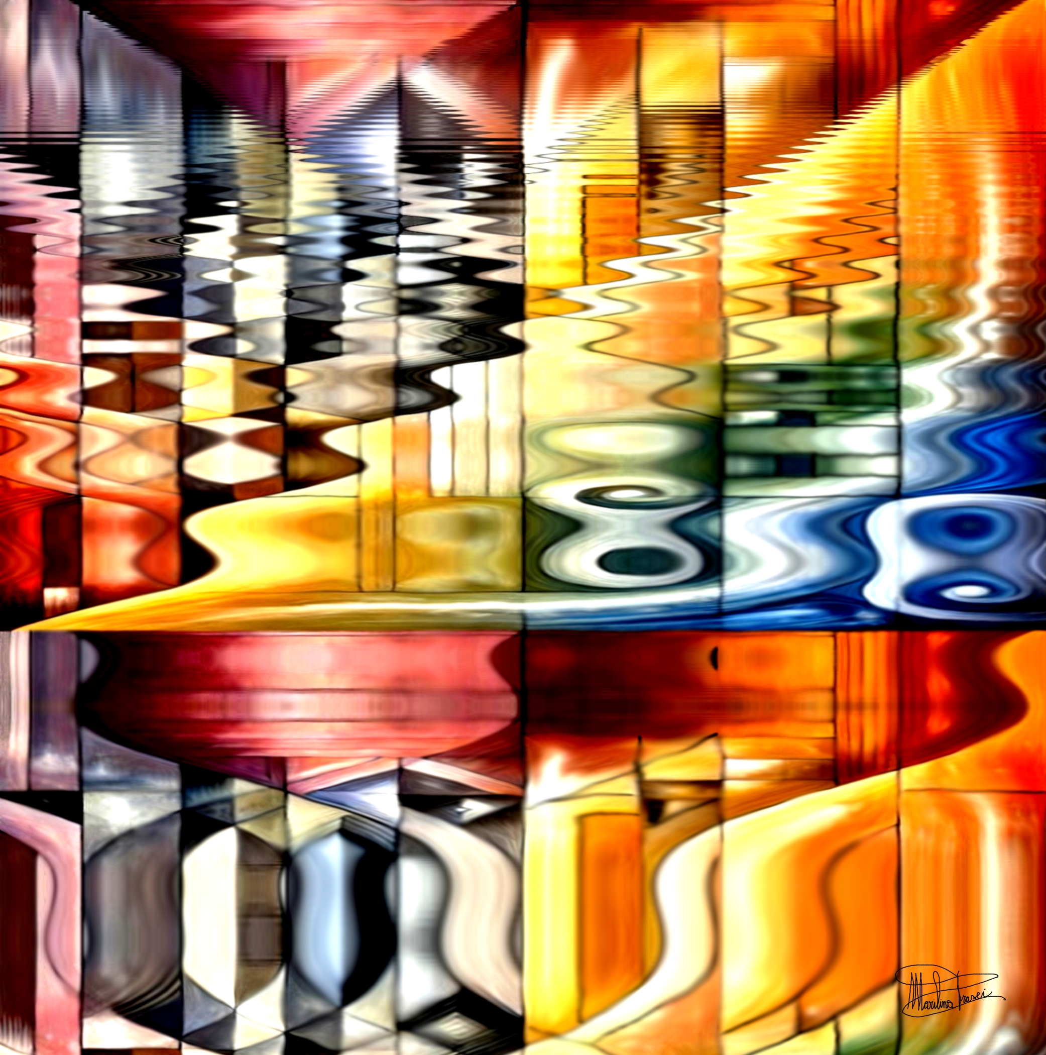 La fluidità dell’opera è accentuata dall’uso magistrale del colore, che sfuma dalle tonalità calde dell’oro e del rosso alle profondità fredde del blu e del verde. Questa transizione cromatica suggerisce un movimento incessante, un respiro visivo che rende l’opera viva e pulsante. A differenza delle rigorose composizioni dell’arte Optical, Geometrie fluide non è solo un gioco percettivo, ma un’esperienza emotiva. Qui la geometria non è una gabbia, ma una traccia su cui la luce e il colore danzano in assoluta libertà.
