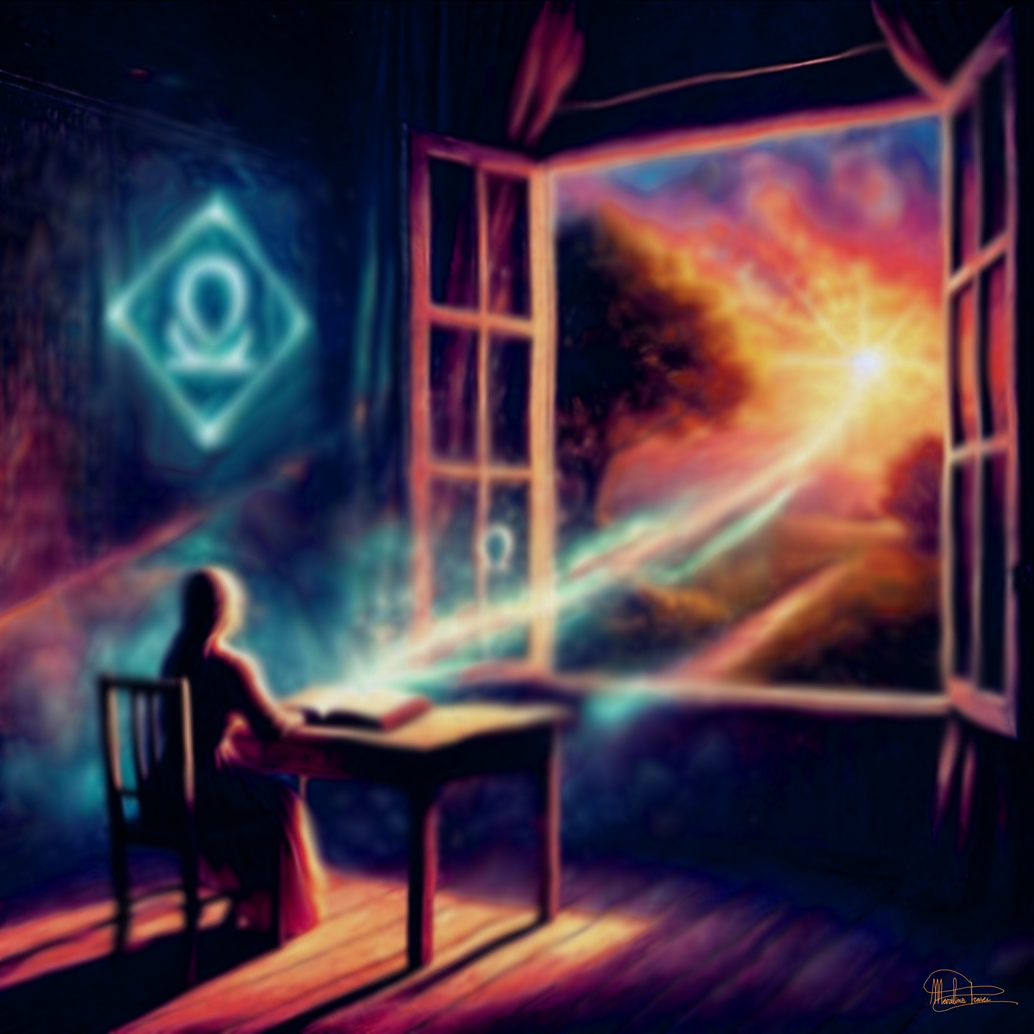La figura umana si dissolve nella scena, divenendo un’entità quasi eterea, simbolo di un’umanità che si fonde con l’energia del cosmo. Il libro sulla scrivania, da cui scaturisce la luce, diventa il fulcro della composizione, espressione di una conoscenza che non si limita al sapere intellettuale, ma si espande come forza spirituale e vitale. La finestra aperta, attraverso cui la luce irrompe nella stanza, non è solo un elemento architettonico, ma una porta simbolica verso l’infinito, verso una dimensione in cui l’arte e la cultura si intrecciano con la felicità dell’anima.