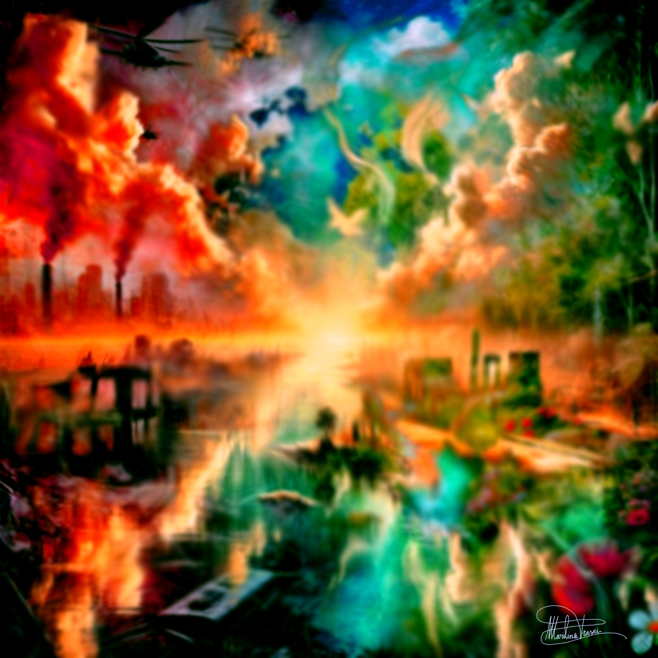 L’opera si colloca idealmente nella tradizione del Romanticismo apocalittico di William Turner, con le sue atmosfere luminose e drammaticamente evanescenti, ma trova un’eco anche nelle visioni simboliche di Böcklin e nei paesaggi post-umani di Zdzislaw Beksinski. Tuttavia, ciò che rende questa composizione unica è la sovrapposizione di una visione astratta e concettuale con la struttura di un paesaggio devastato dalla guerra. Il contrasto tra le tonalità calde e infuocate della distruzione e quelle verdi e azzurre della rinascita restituisce una narrazione visiva in cui il dolore e la speranza convivono in un abbraccio inquietante.