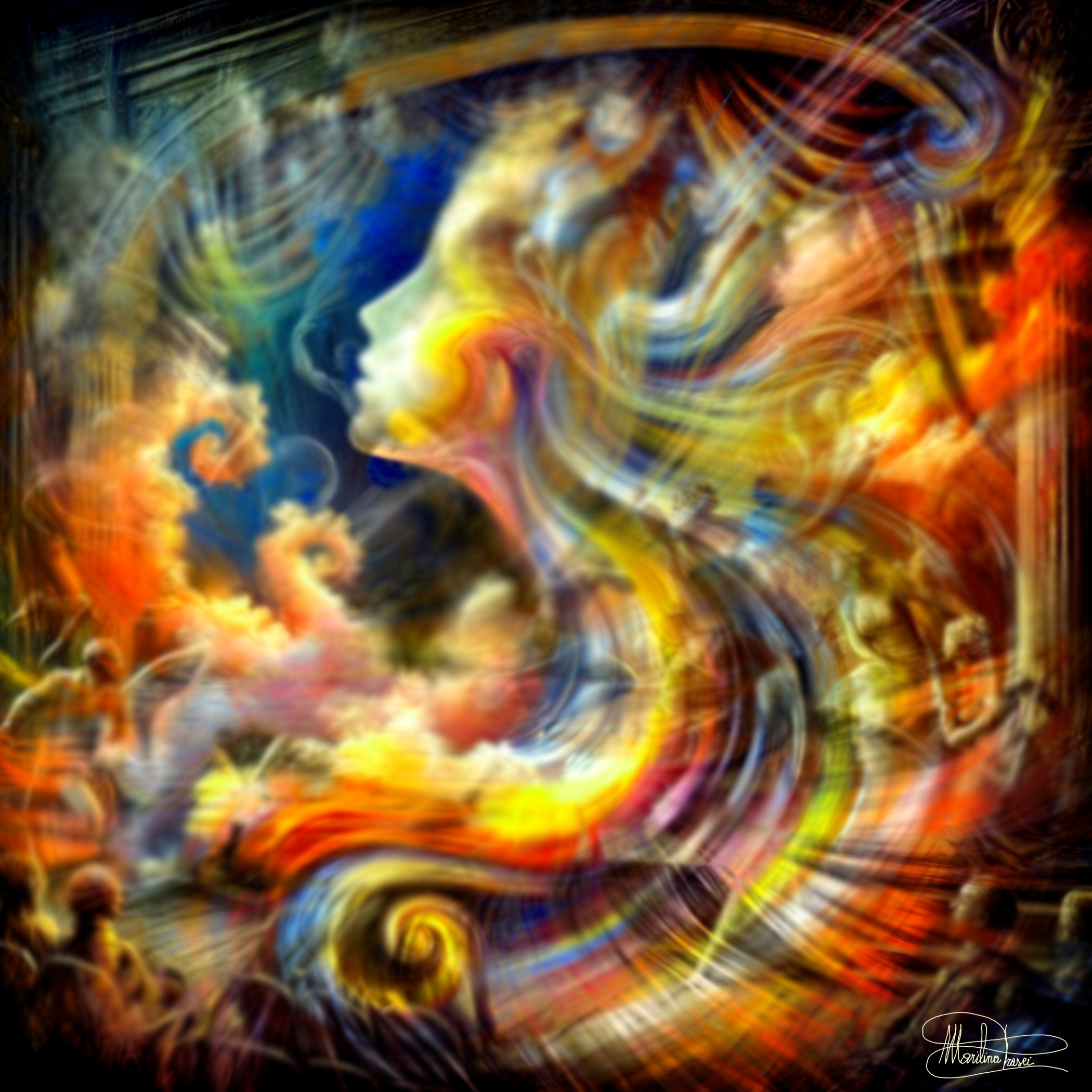 L’uso sapiente della sfocatura atmosferica, ormai cifra distintiva dell’artista, ricorda la lezione dei grandi maestri dell'Impressionismo, come Claude Monet e J.M.W. Turner, che dissolvendo i contorni cercavano di cogliere l’inafferrabile transitorietà della luce e del movimento. Ma Frasci va oltre: il suo tratto digitale si avvicina piuttosto all’Espressionismo visionario, avvicinandola a Odilon Redon e Gustav Klimt, dove la composizione diventa un palcoscenico teatrale, popolato da volti evanescenti, elementi vorticosi e cromatismi incandescenti.