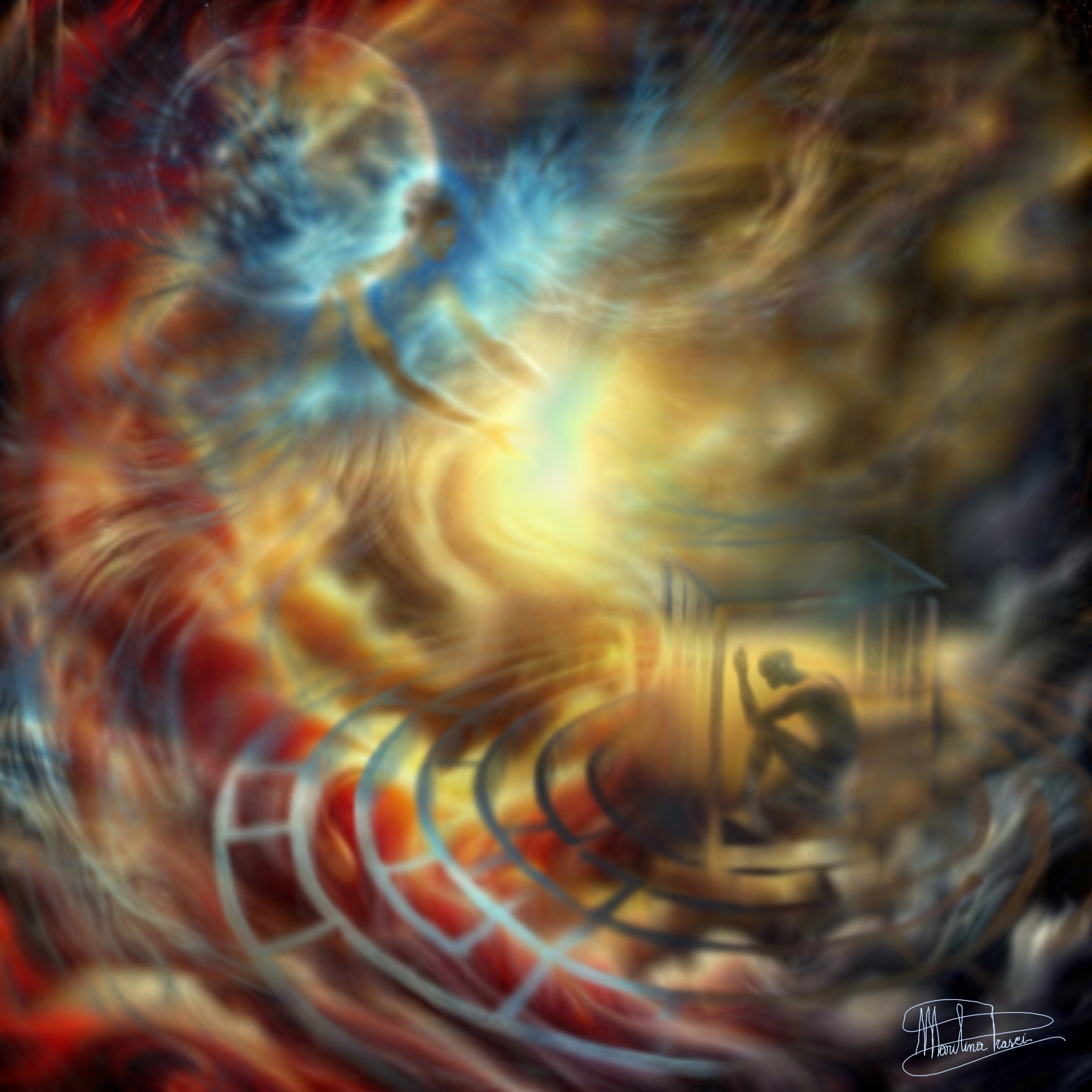 L’immagine si sviluppa attorno a due poli contrastanti: da un lato, una figura eterea, dai contorni luminosi e incorporei, sembra incarnare il principio spirituale, l’energia primordiale che si manifesta in un abbraccio cosmico. Dall’altro, un essere umano, curvo, relegato in una gabbia geometrica che lo costringe nella rigidità della materia, all'interno di un labirinto dalle sfumature infuocate, simbolo della condizione esistenziale dell’uomo contemporaneo.