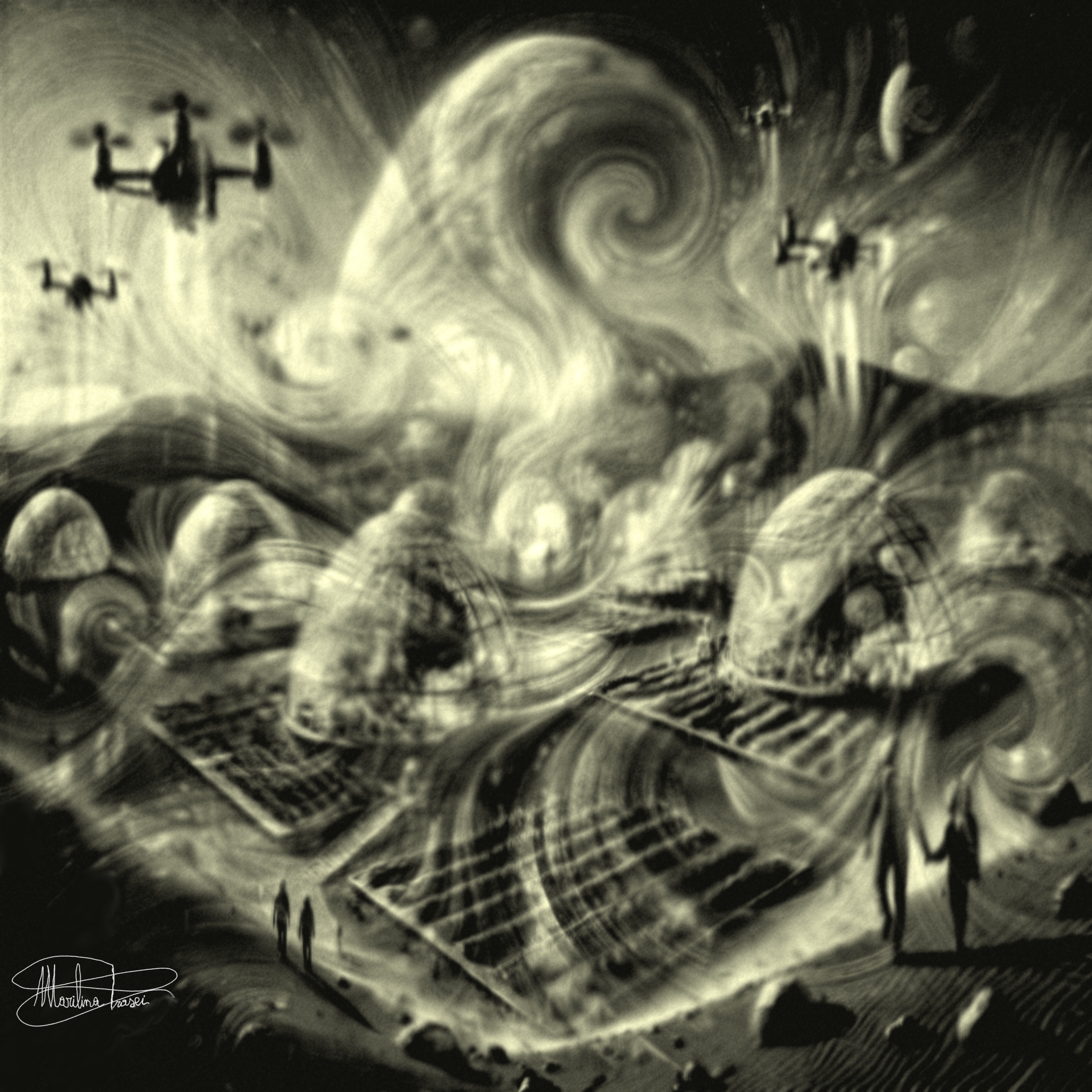 L'opera "La Sopravvivenza" di Marilina Frasci si presenta come una fusione evocativa tra il linguaggio espressionista e il surrealismo visionario. Il monocromo scelto dall'artista conferisce alla scena un'aura sospesa tra passato e futuro, richiamando la tradizione delle stampe fotografiche vintage, mentre la composizione, con il suo dinamismo vorticoso, sembra dialogare con le opere di Vincent van Gogh e le visioni distopiche di Zdzislaw Beksinski.