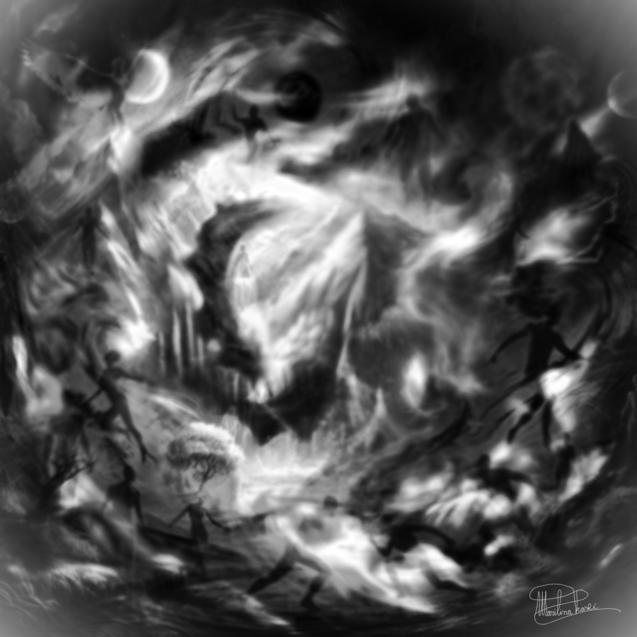 "Il Vortice" non è solo un'immagine: è una narrazione visiva sulla condizione umana. Le figure sembrano trascinate da forze invisibili, sospese in un limbo esistenziale, come se fossero in bilico tra la salvezza e la dannazione. Il contrasto tra il chiaroscuro e la nebbia che avvolge i personaggi amplifica il senso di smarrimento, ma anche di ricerca.