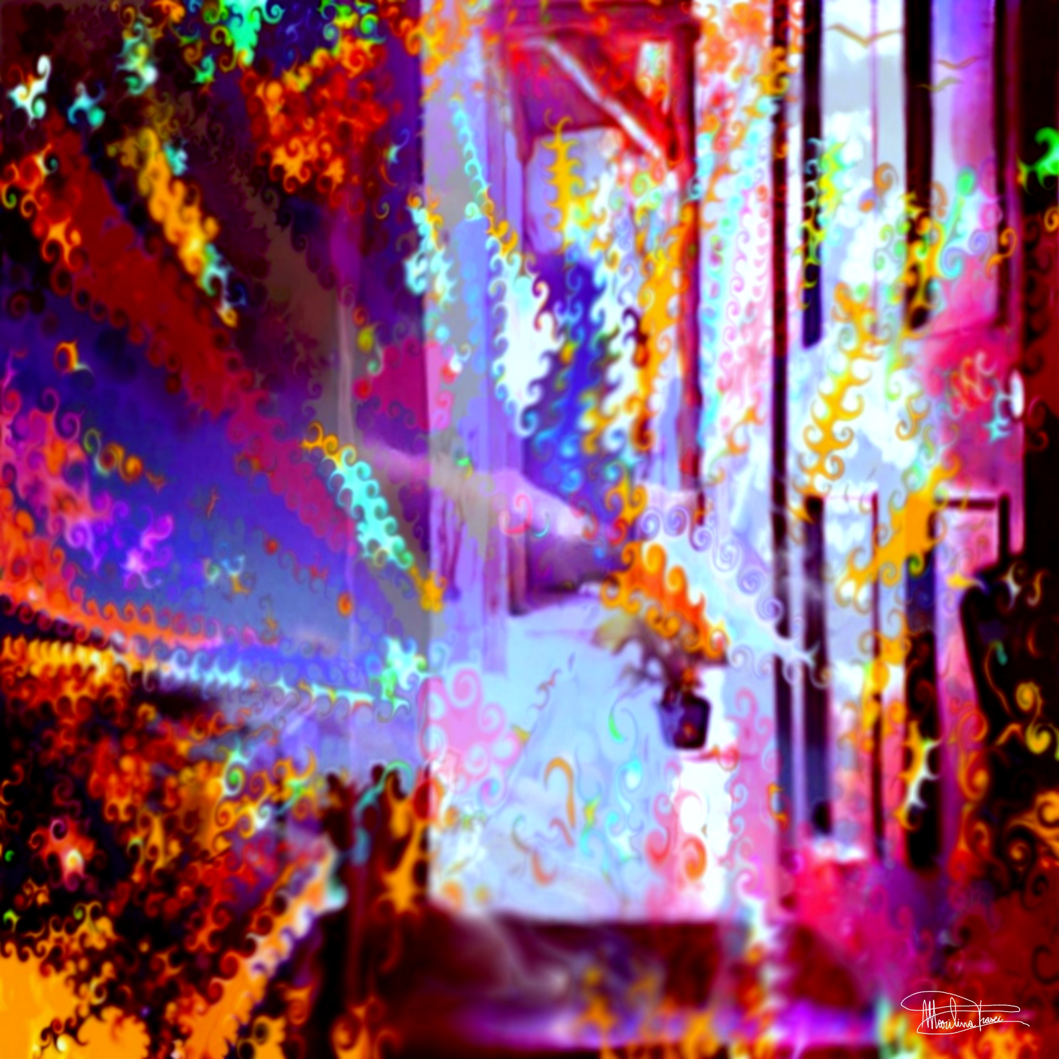 L'opera "Prove d'astratto - L'arte felice - La Porta" di Marilina Frasci è un'esplosione di luce e colore, un varco sensoriale che trasforma la percezione dello spazio in un’esperienza emotiva e immersiva. La porta, elemento simbolico e concreto, si dissolve in una danza di sfumature, evocando il passaggio tra mondi paralleli: realtà e sogno, materia e spirito, conscio e inconscio.