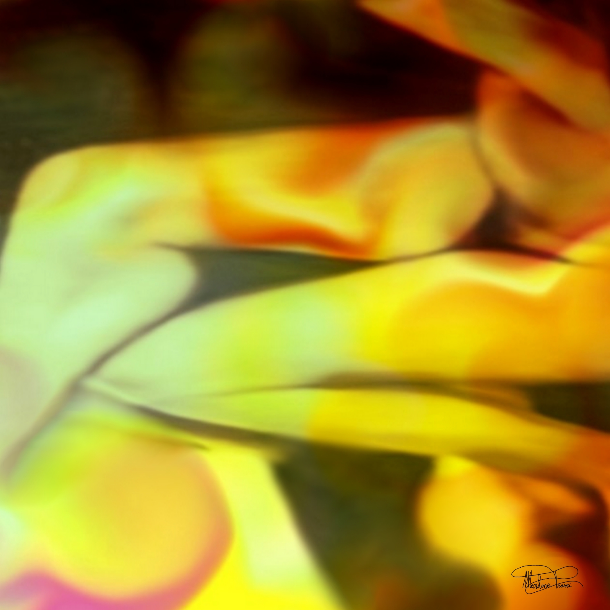 Nell'opera Le spoglie, parte della serie Prove d'astratto - L'arte felice, Marilina Frasci porta avanti un’indagine visiva che sembra interrogare il rapporto tra materia e dissolvenza, tra presenza e memoria. L’immagine si compone di flussi cromatici che si sfaldano in una sinfonia luminosa, dove il giallo dorato e le venature aranciate evocano un tramonto che si consuma su una superficie liquida, quasi specchiante.