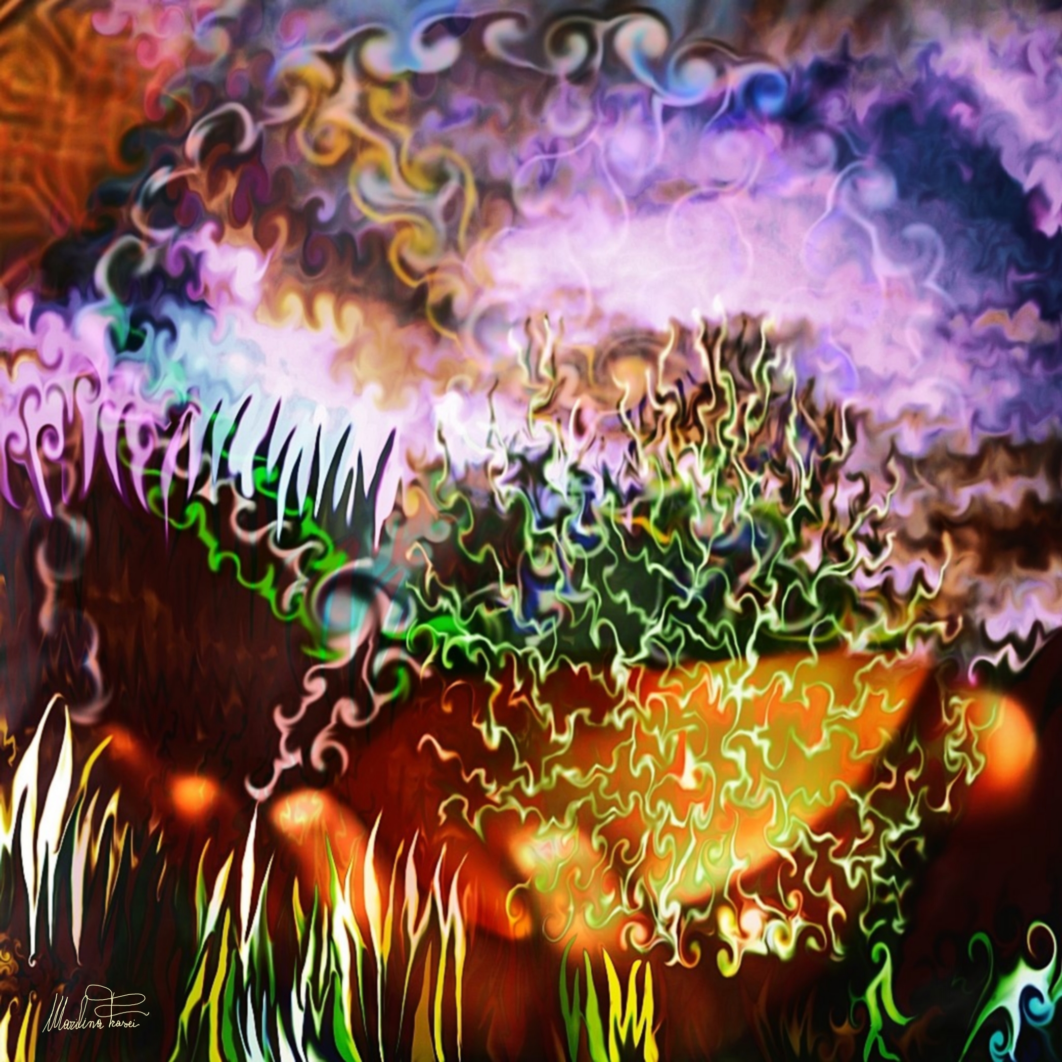 Marilina Frasci, con "Prove d'astratto - l'arte felice - La Mano", ci accompagna in una dimensione in cui la pittura digitale si fa vibrazione, energia pulsante che attraversa la tela con la forza di un sogno in movimento. La composizione si accende di colori incandescenti, dove il verde elettrico si intreccia a bagliori dorati e a nubi iridescenti, in un continuo dialogo tra caos e armonia. La struttura dinamica dell'opera sembra evocare la gestualità dell'Action Painting di Jackson Pollock, ma qui l'energia non si disperde in un gesto irrazionale: si organizza in una danza sinuosa che richiama le linee decorative dell'Art Nouveau e la ricerca spirituale di artisti come Gustav Klimt e Odilon Redon.