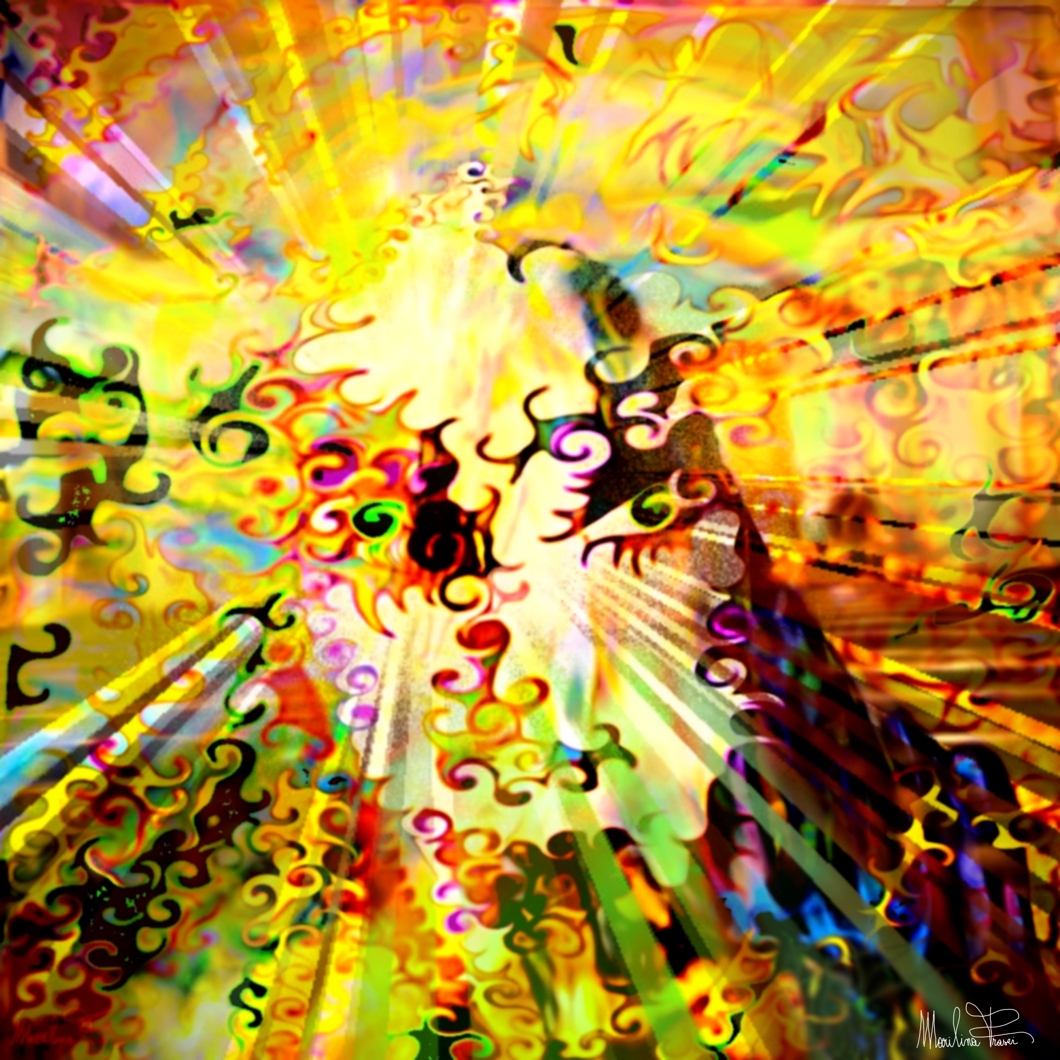 Il tratto vibrante, quasi calligrafico, richiama l'espressionismo astratto di Kandinsky, il quale concepiva il colore come linguaggio dell’anima, eppure si spinge oltre, in una danza simbolica più vicina al surrealismo visionario di Dalí o di Ernst. Le volute e le spirali luminose, che sembrano scolpire l’immagine nello spazio, rimandano alla lezione dell’Art Nouveau, in particolare alle linee dinamiche di Mucha o di Klimt, ma qui l’oro si smaterializza in puro bagliore, in una sorta di alchimia digitale.