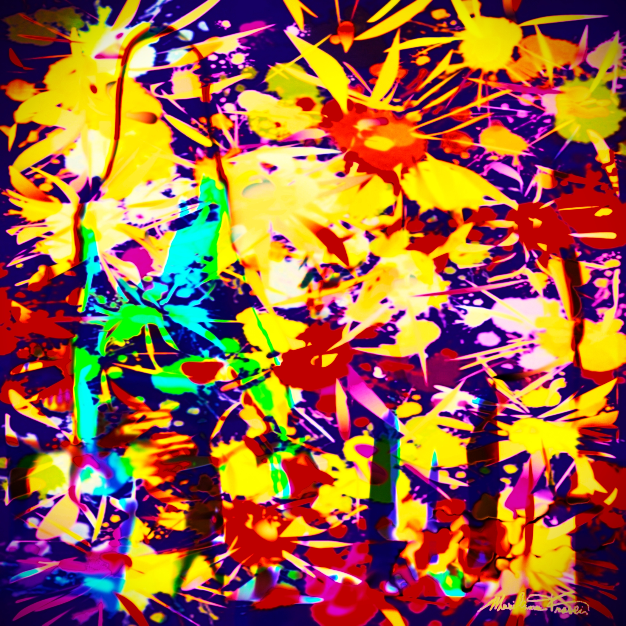 Le pennellate digitali sembrano galleggiare, sospese in uno spazio liquido e fluido, dove la tavolozza si fa fuoco d’artificio: gialli incandescenti, rossi pulsanti, blu profondi e verdi smeraldo si rincorrono, si sovrappongono, si fondono. Il fondo scuro agisce da palcoscenico silenzioso su cui la vitalità luminosa dei colori mette in scena una sinfonia visiva.