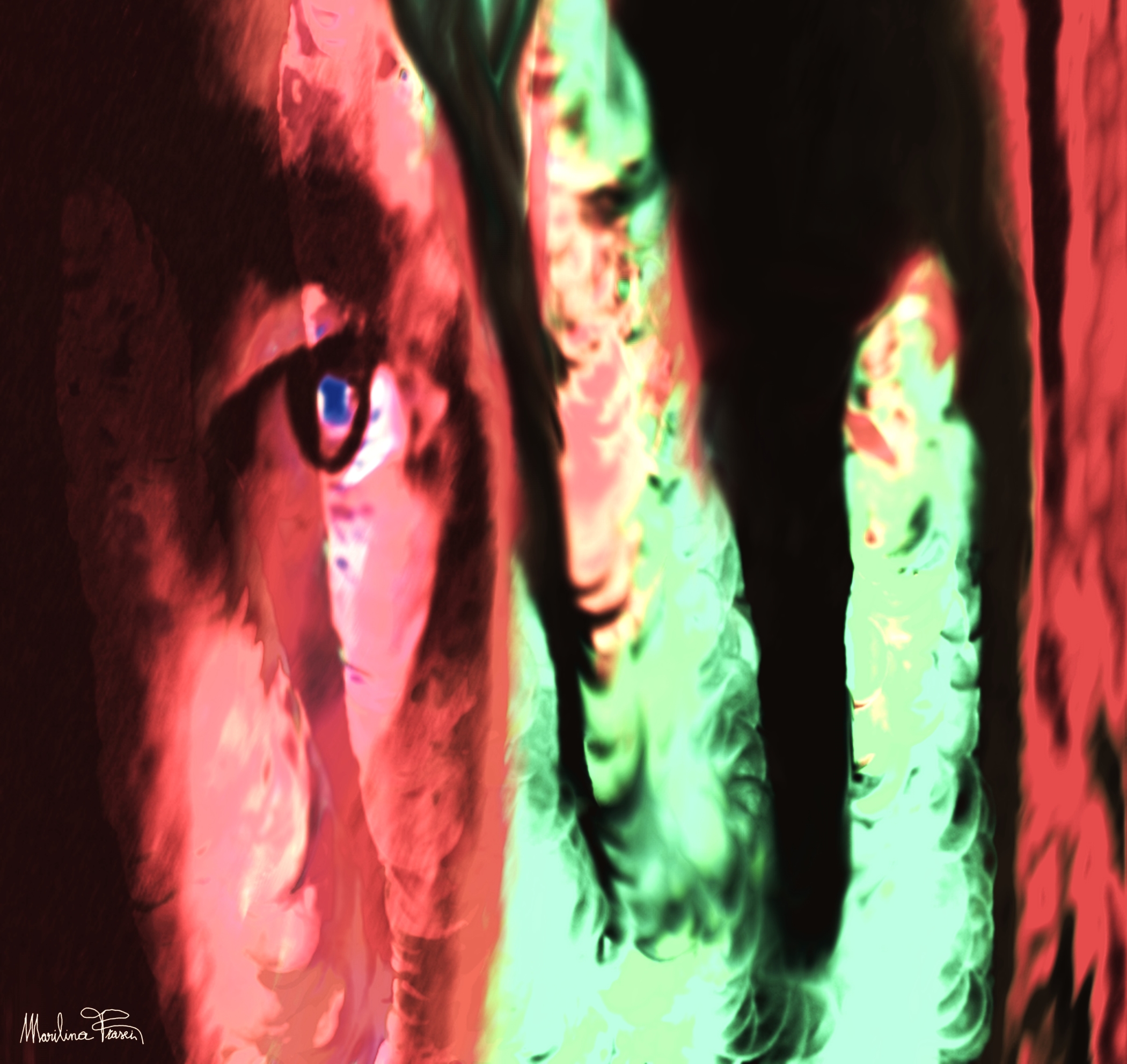 Ciò che colpisce immediatamente è il contrasto tra i toni caldi e freddi: un rosso vivo che scivola sul volto e un verde acido e luminoso che circonda e stratifica la parte destra dell’opera. Questi colori si comportano come forze opposte ma complementari, memori dell’azione espressionista di un Munch o della tensione cromatica di un Rothko digitale. Tuttavia, Frasci non si limita a evocare; lei stratifica, sfuma, plasma la luce come farebbe un Turner postmoderno, ma con la visione contemporanea di chi conosce le pieghe dell’interiorità attraverso il mezzo tecnologico.