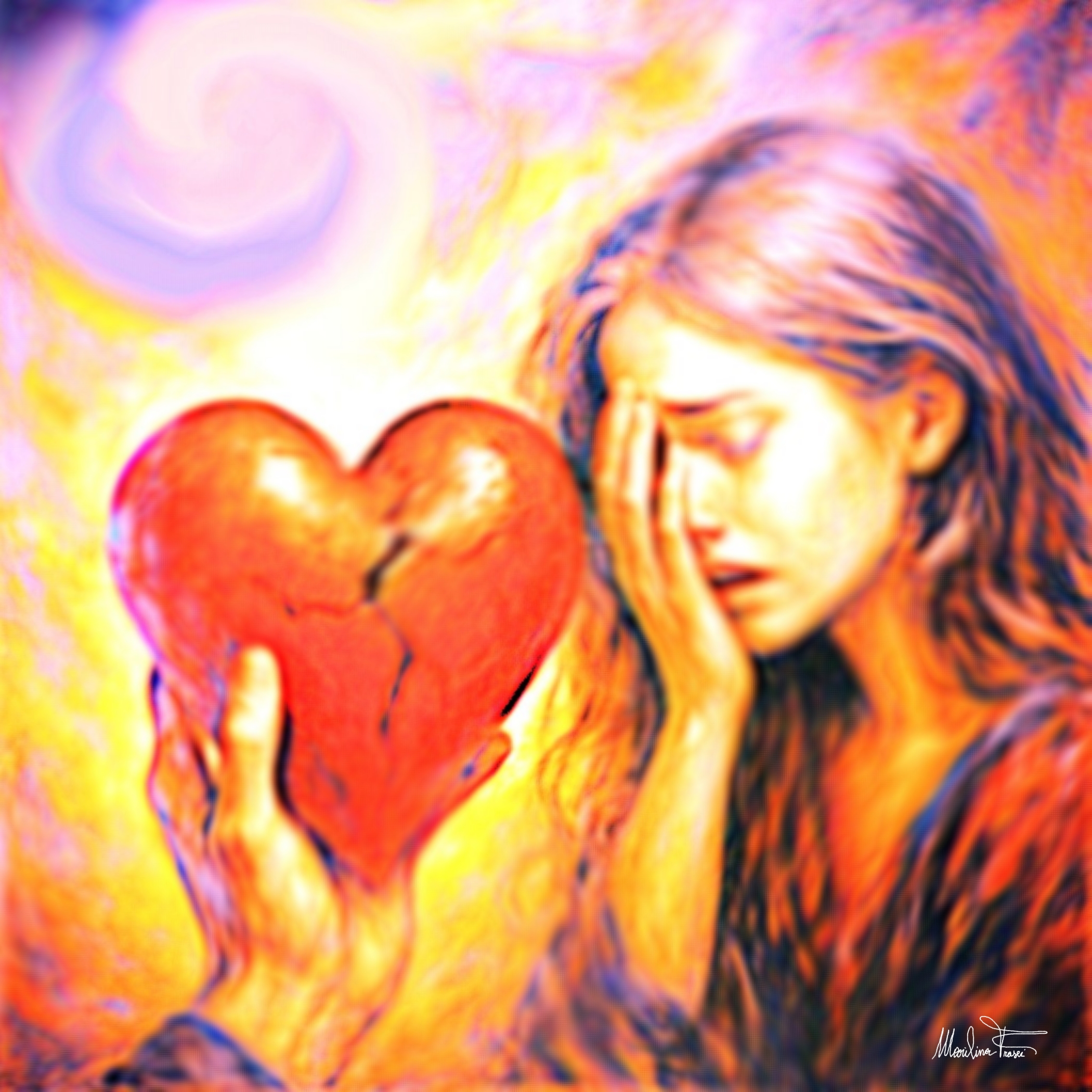 Infine, la terza immagine – probabilmente la più emblematica – è un quadro che colpisce con la forza di una verità sussurrata. Il cuore, tenuto da una mano e offerto con un gesto di tragica sincerità, è crepato ma integro, pulsante di rossi drammatici. Il volto della donna, trafitto dalla sofferenza, richiama la pietà michelangiolesca, ma con la vulnerabilità moderna di un Egon Schiele in cerca di redenzione. I colori, caldi e acidi al tempo stesso, suggeriscono il paradosso dell’amore: dolce e doloroso, sacro e profano, eterno e fragile. In questa rappresentazione, Frasci si avvicina idealmente al Simbolismo, ma lo riscrive con vocabolario contemporaneo, affidando al digitale una potenza comunicativa che non teme paragoni con i media tradizionali.