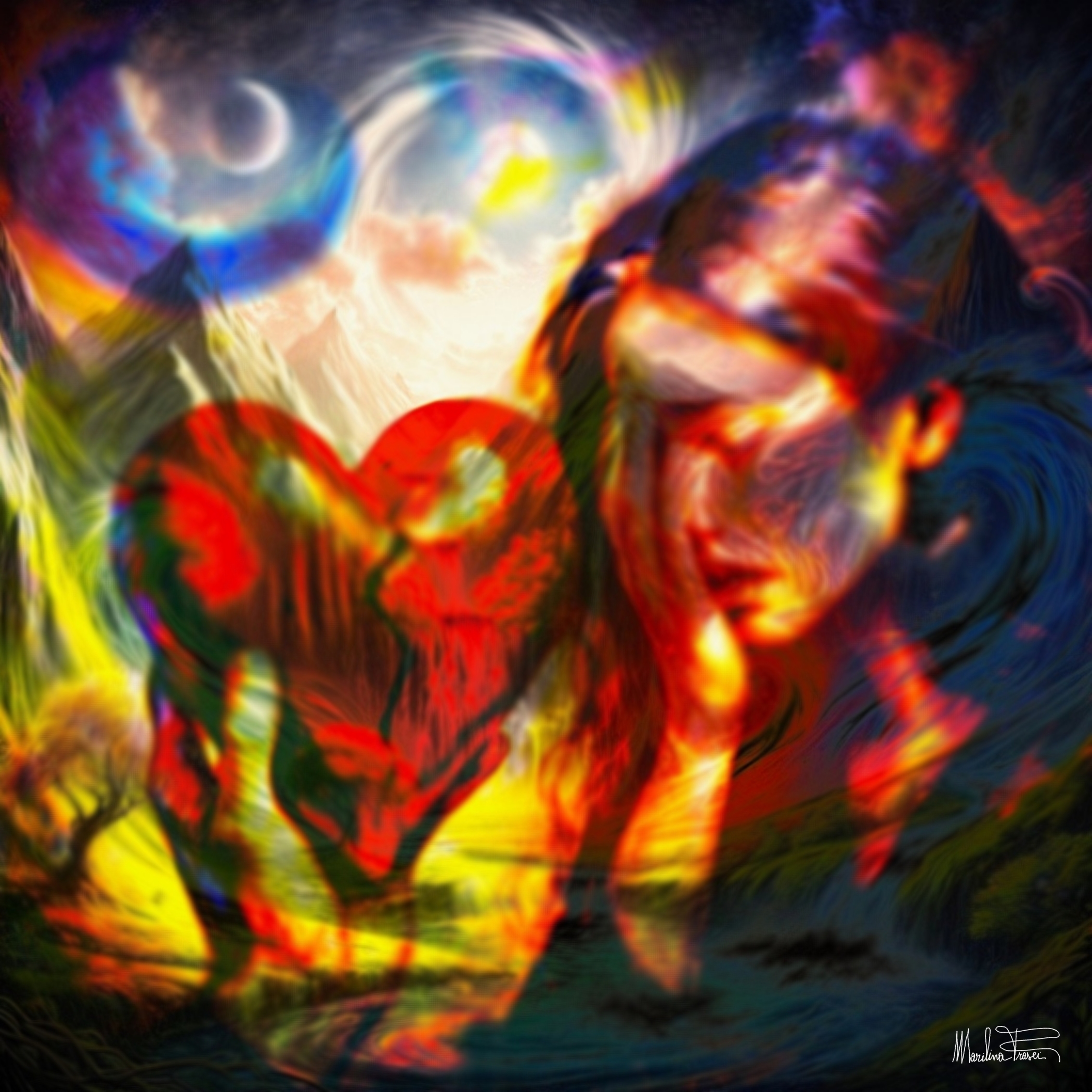 Infine, la terza immagine – probabilmente la più emblematica – è un quadro che colpisce con la forza di una verità sussurrata. Il cuore, tenuto da una mano e offerto con un gesto di tragica sincerità, è crepato ma integro, pulsante di rossi drammatici. Il volto della donna, trafitto dalla sofferenza, richiama la pietà michelangiolesca, ma con la vulnerabilità moderna di un Egon Schiele in cerca di redenzione. I colori, caldi e acidi al tempo stesso, suggeriscono il paradosso dell’amore: dolce e doloroso, sacro e profano, eterno e fragile. In questa rappresentazione, Frasci si avvicina idealmente al Simbolismo, ma lo riscrive con vocabolario contemporaneo, affidando al digitale una potenza comunicativa che non teme paragoni con i media tradizionali.