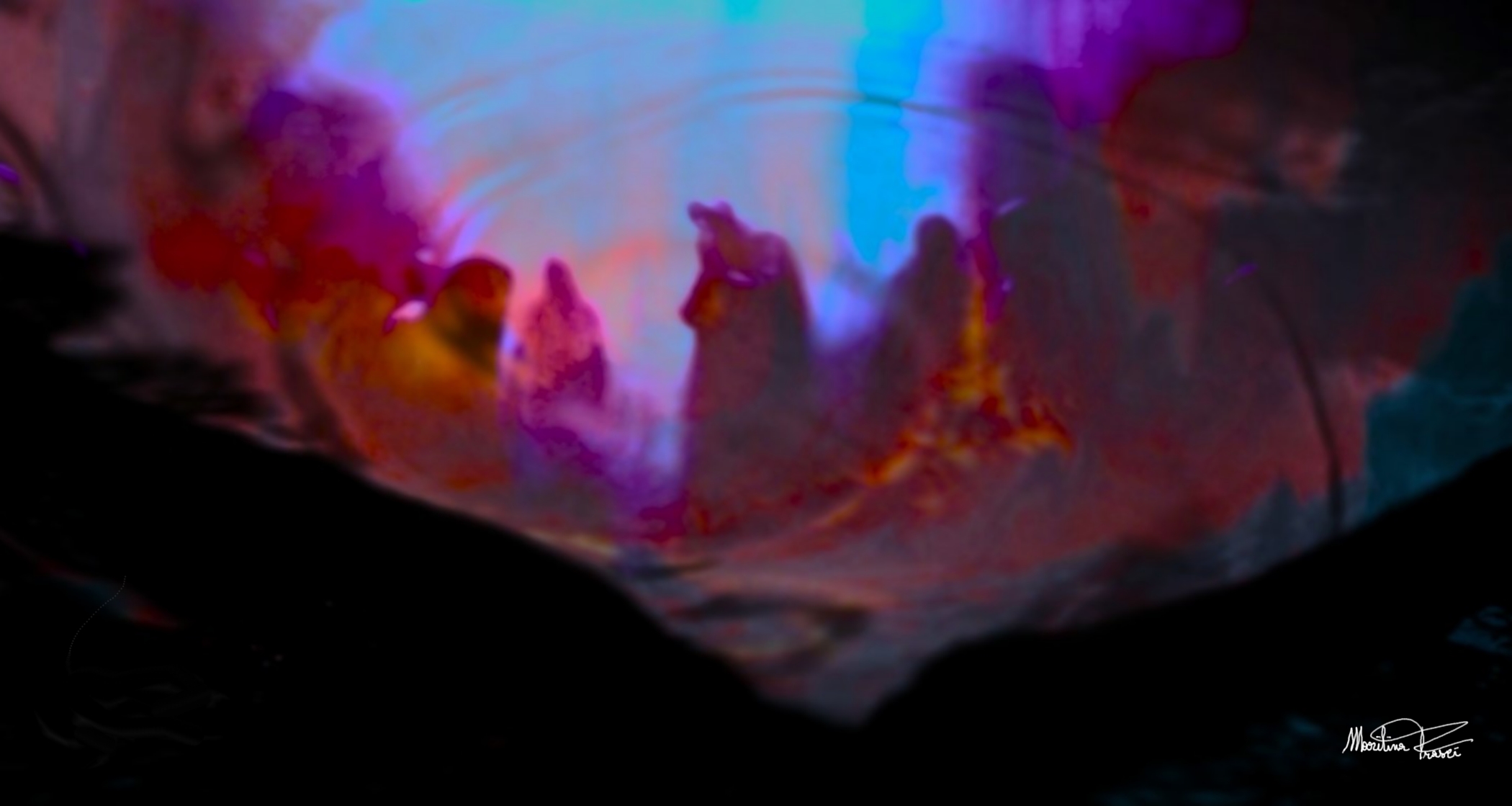 Marilina Frasci, artista digitale italiana nata nel 1963 a Nocera Inferiore e attiva dal 2003 sul portale Drudylla.it, dove ha costruito un corpus di opere che fondono pittura tradizionale e manipolazione fotodigitale, presenta in *Prove d’Astratto – L’Arte Felice – Anime Purganti* un manifesto visivo dell’astrazione emotiva. Quest’opera, parte di una serie esplorativa che indaga i confini tra figurativo e metafisico, cattura un vortice cromatico – dominato da blu ciano, viola profondi e rossi magmatici – dove sagome umane evanescenti emergono come anime in transito, sospese tra catarsi e oblio. La firma autografa, stilizzata in un’elegante cursiva, sigilla l’opera come un talismano personale, evocando l’intimità di un diario interiore. Tecnnicamente, Frasci impiega tool digitali avanzati (quali layer di blending mode in software come Photoshop) per creare gradienti fluidi e contrasti iper-saturi, generando un’illusione di profondità tridimensionale attraverso deformazioni prospettiche e filtri gaussiani, che mimano la resa pittorica senza il vincolo del supporto fisico.