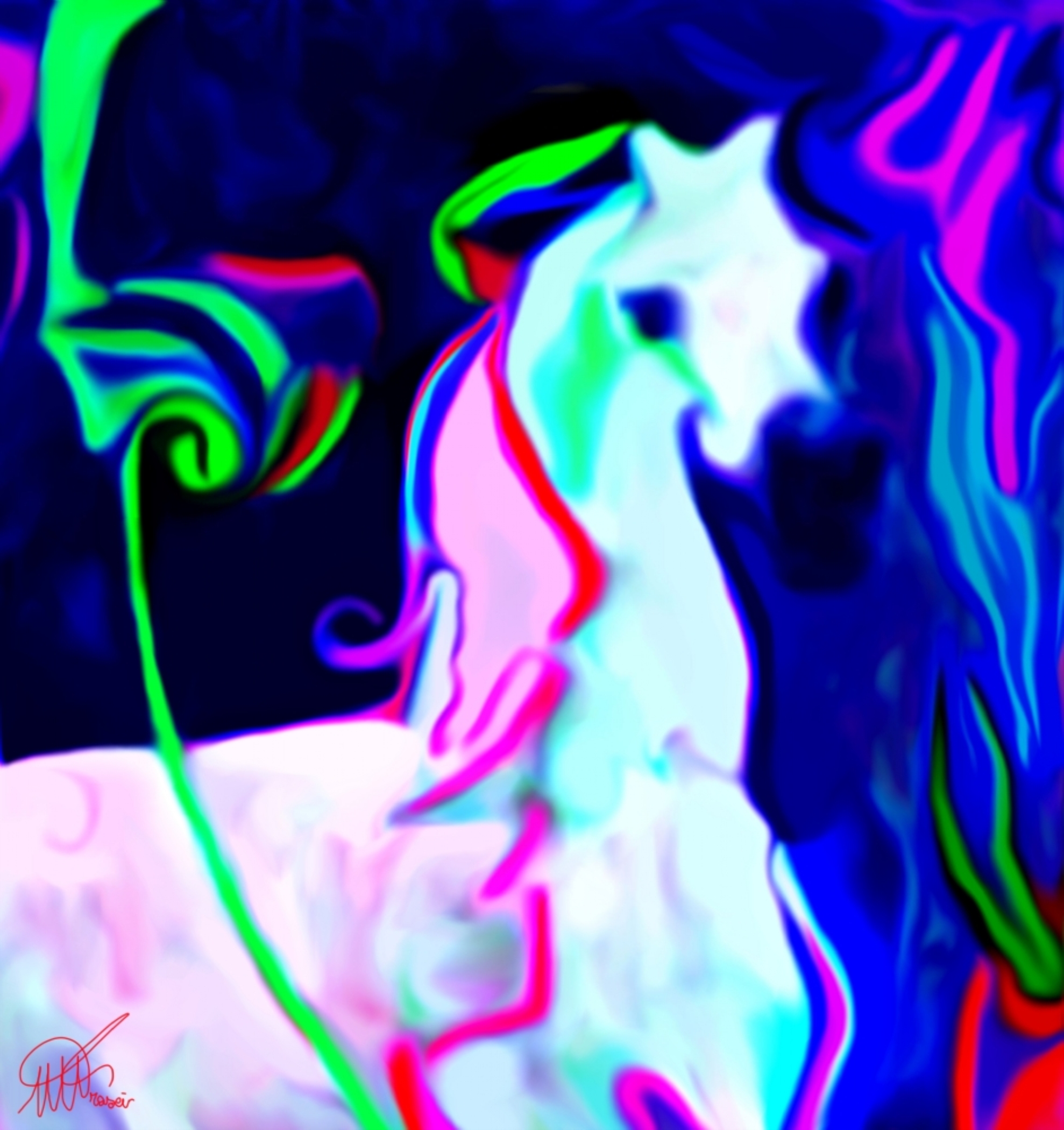 Nell’opera "Profili d’esistenze", Marilina Frasci distilla la materia visiva fino a renderla puro flusso di colore, dove la figurazione si dissolve e si ricrea in un gioco di percezioni fluide e vibranti. L’immagine si muove tra astrazione e riconoscibilità, evocando un cavallo etereo, un’entità sospesa tra dimensioni, dove i confini della forma si sfaldano in un’energia cromatica viva e pulsante.