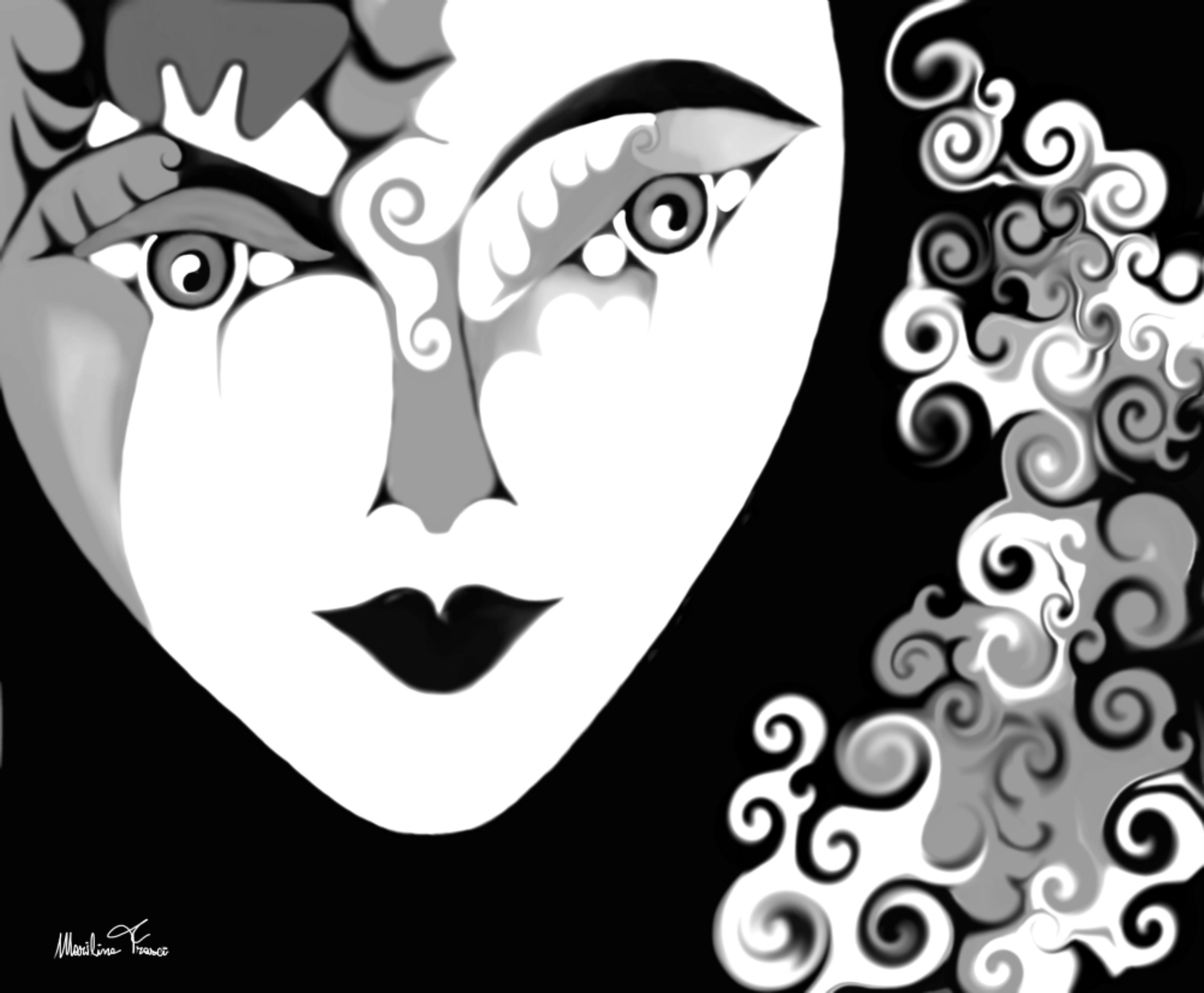 In "LA MASCHERA 2", Marilina Frasci esplora l’ambivalenza dell’identità e la sua mutevolezza attraverso un linguaggio visivo che attinge dalla tradizione del ritratto espressionista e dall’arte digitale contemporanea. L’assenza del colore, che nella precedente versione della maschera animava il volto con contrasti ardenti, qui si tramuta in un gioco di luci e ombre, di pieni e vuoti, dove l’essenza del soggetto si scompone e si ricostruisce in una tensione emotiva densa e sfuggente.